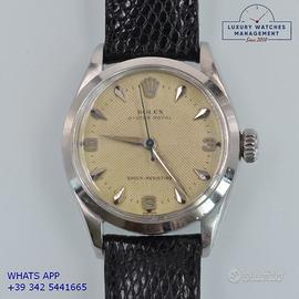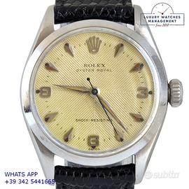 Rolex Oyster Royal 31MM acciaio, anno di produzione 1956, ghiera acciaio liscia, vetro plastica bombato, quadrante colore avorio a spina di pesce con indici e sfere a foglia al radio, movimento meccanico a carica manuale, cinturino in pelle di lucertola colore nero con fibbia acciaio originale Rolex.