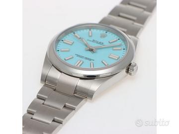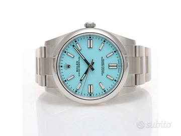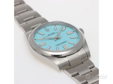 Clover Gioielli pone in vendita Rolex Oyster Perpetual Ref. 124300 realizzato in acciaio, Quadrante "Tiffany" turchese, Lunetta liscia in acciaio, Cassa di diametro 41 mm, Corona di carica a vite, Bracciale modello oyster in acciaio. Orologio in condizioni eccellenti. Garanzia datata 12/2020. Full Set. Orologio fuori produzione.