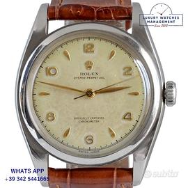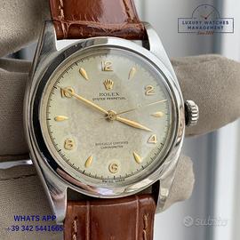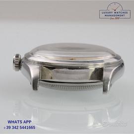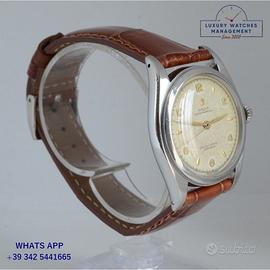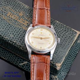Rolex Oyster Perpetual 6028 “Ovettone” Big BubbleBack acciaio, anno di produzione 1952, ghiera acciaio liscia, vetro plastica a cupola, quadrante colore avorio con indici arabi sfere Dauphine originale Rolex dell’epoca, movimento meccanico automatico, cinturino in pelle di alligatore lucido colore cognac con fibbia acciaio Rolex.
