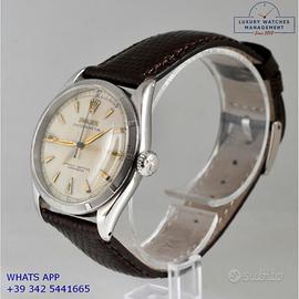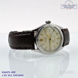 Rolex Oyster Perpetual Chronometer acciaio, anno di produzione 1954, vetro plastica bombato, ghiera Turn o Graph zigrinata acciaio, quadrante lavorazione a nido d’ape colore avorio indici sfaccettati e lancette a foglia al radio originale Rolex dell'epoca mai ritoccato o ristampato, movimento meccanico a carica automatica, cinturino lucertola colore marrone lucido con fibbia acciaio originale Rolex.