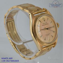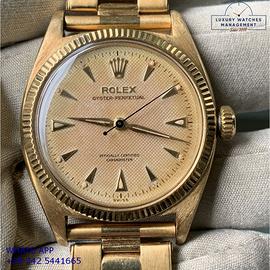 Rolex Oyster Perpetual Chronometer oro giallo 18KT, anno di produzione 1957, vetro plastica bombato, ghiera zigrinata oro giallo 18KT, quadrante lavorazione a nido d’ape virato al colore crema indici sfaccettati e lancette a foglia oro giallo 18KT originale Rolex dell'epoca, movimento meccanico a carica automatica, bracciale Oyster oro giallo 18KT a rivetti con chiusura deployante originale Rolex dell’epoca.