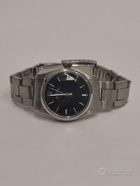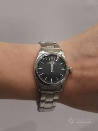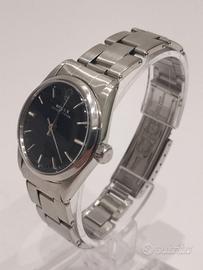 Quadrante nero sobrio con indici a bastone e lancette argentate, vetro plexiglas, bracciale Oyster in acciaio con chiusura originale.
