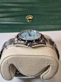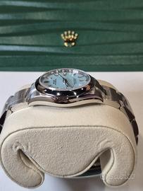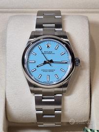 Rolex Oyster Perpetual 31 mm tiffany Ref. 277200 Quadrante Azzurro “Tiffany” – Luglio 2025 – Mai Indossato Proposto in condizioni assolutamente pari al nuovo, questo raffinato Rolex Oyster Perpetual 31 mm referenza 277200 con iconico quadrante azzurro Tiffany rappresenta una delle configurazioni più ricercate e contemporanee della collezione Oyster. Acquistato presso Concessionario Ufficiale Rolex a luglio 2025, l’orologio è mai stato indossato e conservato con la massima cura. Garanzia internazionale Rolex attiva. Caratteristiche principali •Cassa: 31 mm in Oystersteel •Quadrante: Azzurro Tiffany con indici applicati •Movimento: Automatico Rolex Perpetual, certificato Cronometro Superlativo •Bracciale: Oyster in acciaio Oystersteel con chiusura Oysterclasp •Vetro: Zaffiro antigraffio •Impermeabilità: 100 metri Condizioni Esemplare nuovo, mai indossato, privo di segni o imperfezioni. Non lucidato. Non utilizzato. Stato collezionistico. Corredo completo (Full Set) •Scatola Rolex originale •Controscatola •Garanzia ufficiale datata luglio 2025 •Manualistica completa •Porta documenti •Sigillo •. Scontrino Un segnatempo dall’estetica fresca e distintiva, destinato a mantenere forte desiderabilità nel tempo, ideale sia per utilizzo personale sia per collezione. Valuto scambio con cartier, Patek