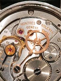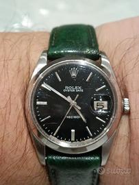 Rolex Oyster Precision ref. 6694, un'icona vintage dal carattere unico che non passa mai di moda Caratteristiche principali:Cassa da 34 mm in acciaio inox con qualche segno del tempo.Movimento Rolex calibro 1225, carica manuale, non revisionato di recente, ma mantiene il tempo ed e' preciso.Quadrante nero di grande impatto visivo, che come appare in foto, tra le ore 5 e le ore 7 è usurato.Vetro plexiglass originale Rolex con qualche lieve graffio.Cinturino generico in pelle verde con segni di usura e fibbia Rolex.In base al seriale "10674xx" leggibile con lente, l'anno di produzione e' il 1964-1965, anche se nel certificato allegato in foto, il rivenditore ha scritto erroneamente 1980 circa.Le foto sono parte integrante della descrizione.L'orologio come da foto allegate, ha la scatola generica verde, e certificato di garanzia del rivenditore che l'ha venduto precedentemente nel 2000.Per qualsiasi domanda, sono a vostra disposizione.