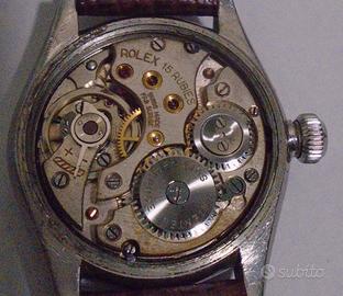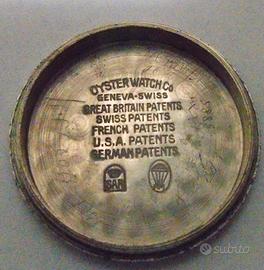 Un bell'esempio di Rolex Oyster della Seconda Guerra Mondiale, quadrante argentato bicolore con numeri arabi neri, conserva le sue lancette alfa originali in acciaio azzurrato, quadrante non firmato, il che significa che l'orologio potrebbe essere stato utilizzato nel militare, quadrante piacevolmente invecchiato con una superba patina. Movimento Rolex 10 1/2 H a carica manuale in buone condizioni di funzionamento con la dicitura "Rolex 15 Rubies Swiss made Fab Suisse Patent Super Balance". La cassa Oyster in acciaio inossidabile (lievissima ammaccatura sul fondello) contrassegnata sul fondello con il numero di modello 3121 e il numero di serie 106833 indica che l'orologio è stato realizzato intorno al 1938 con una corona contrassegnata con una corona Oyster a vite contrassegnata con la dicitura "Oyster Patented", interni contrassegnati con la dicitura "Oyster Watch Company Geneva-Swiss Great Britain Patents Geneva-Swiss Great Britain Patents Swiss Patents French Patents U.S.A. Patents Brevetti tedeschi SAR con corona "SAR" sotto una corona o una corona La corona è talvolta visibile nel fondello degli orologi Rolex. Questo marchio non sembra essere registrato da nessuna parte. SAR potrebbe essere l'acronimo di "Société Anonyme Rolex". Viene fornito con un cinturino da 15 mm non originale.
