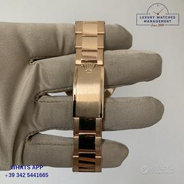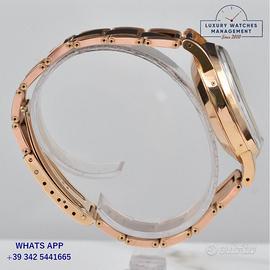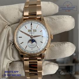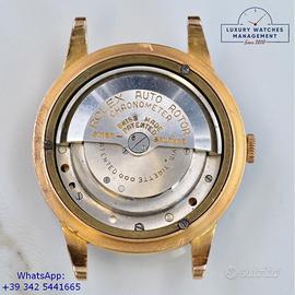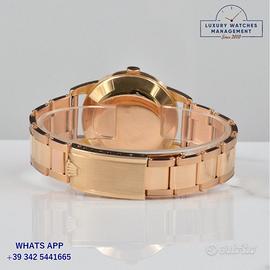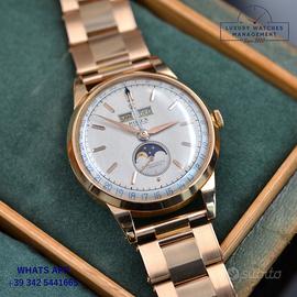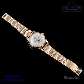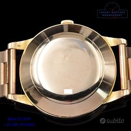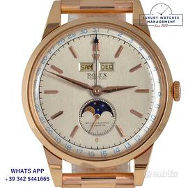 Rolex “Padellone” 8171 calendario completo con fasi lunari oro rosa 18KT, anno di produzione 1950, ghiera liscia oro rosa 18KT, vetro plastica bombato, raro quadrante argento bicolore tripla data con fasi lunari, indici e lancette oro rosa 18KT originale Rolex dell'epoca mai ritoccati o ristampato, movimento meccanico a carica automatica, bracciale Oyster oro rosa 18KT a rivetti (restaurato) con deployante originale Rolex dell'epoca, più altro cinturino in alligatore colore marrone lucido con fibbia dorata originale Rolex.