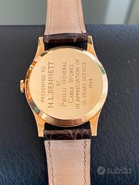 Sul fondello è presente un’incisione storica, testimonianza della consegna dell’orologio come riconoscimento aziendale, che ne aggiunge fascino e unicità.