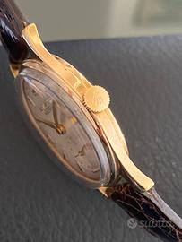 Elegante e autentico Rolex Precision del 1957 in oro 9 carati, con quadrante originale splendidamente invecchiato e indici dorati applicati.