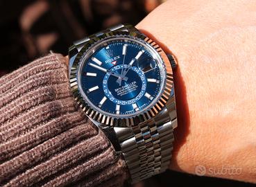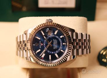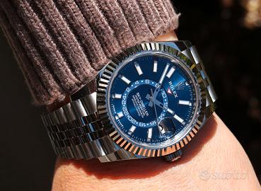 Proponiamo uno dei modelli più iconici e ricercati della collezione Rolex: il Sky-Dweller ref. 336934 con quadrante blu, anno 2025, nella configurazione in acciaio Oystersteel con lunetta zigrinata in oro bianco. Un orologio che rappresenta il perfetto equilibrio tra sportività, eleganza e alta complicazione, pensato per chi vive il mondo senza confini. Il protagonista assoluto è il suo quadrante blu soleil, estremamente luminoso e dinamico, capace di catturare la luce in ogni angolazione, rendendo questo modello uno dei più desiderati e “liquidi” sul mercato. Caratteristiche principali: Cassa da 42 mm in Oystersteel Lunetta zigrinata in oro bianco con sistema Ring Command Movimento automatico Rolex calibro 9002 Funzione doppio fuso orario (GMT) Calendario annuale Saros (regolazione solo 1 volta l’anno) Riserva di carica di circa 72 ore Impermeabilità fino a 100 metri Bracciale Jubilee con sistema Easylink Full Set 2025 Perché sceglierlo Il Rolex Sky-Dweller è il modello più complesso della linea classica Rolex, progettato per viaggiatori e collezionisti esigenti. Combina una lettura intuitiva del secondo fuso orario con un calendario annuale estremamente pratico, il tutto racchiuso in un design iconico. La versione con quadrante blu in acciaio è oggi tra le più richieste in assoluto, grazie alla sua versatilità quotidiana e forte tenuta di valore nel tempo. Conclusione vendita Un segnatempo di alto livello, ideale sia come orologio da utilizzo quotidiano che come pezzo da collezione. Elegante sotto il polsino, sportivo nel carattere, esclusivo per presenza.