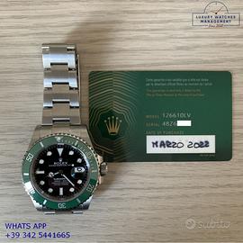 Rolex Submariner 126610LV con data 41MM acciaio Oystersteel, anno di produzione 2022, ghiera acciaio unidirezionale con inserto in ceramica MK1 colore verde, vetro zaffiro antiriflesso con lente ciclope, quadrante colore nero con data indici e sfere al Chromalight, movimento meccanico a carica automatica, bracciale Oystersteel acciaio con chiusura deployante Oysterlock originale Rolex.