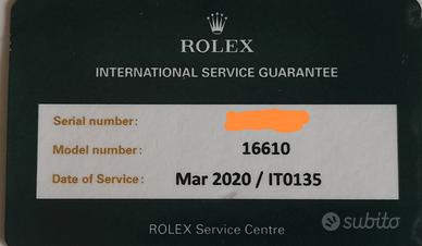 Orologio che non ha bisogno di presentazioni Completo di tutto, scatola, cordone, libretti, card revisione ufficiale Rolex maggio 2020, revisione completa! Non accetta alcun tipo di permuta! Mai Lucidato In ottimo stato! segni di usura dovuti all'utilizzo! Versione RRR con la scritta ROLEX sul rehaut prodotto per soli 3 anni, non il comune submariner che si trova dappertutto! Manca la garanzia originale però ha la card della revisione ufficiale rolex con relativa garanzia di 2 anni ormai scaduta(in foto) ! per favore no offerta assurde oppure richieste strane, sono un venditore esperto e il tutto verrà portato a termine in piena garanzia del venditore e dell'acquirente! possibile spedizione con corriere FERRARI o ritiro di persona presso concessionario di mia fiducia!