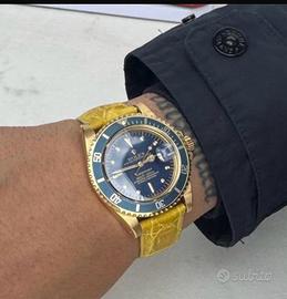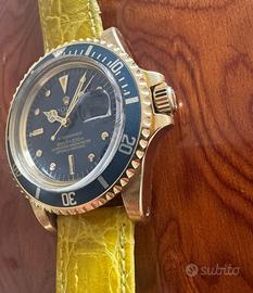 ROLEX SUBMARINER Yellow gold ref 1680/8 mis 40mm vetro plexi mov 1570 con quadrante nipple blu inserto ghiera blu virato dal tempo anno 1976 completo di scatola e garanzia rolex cartacea dell’epoca,orologio da collezione in condizioni impeccabili pressoché introvabile!dichiaro che l’oggetto e’originale 100%.NO perditempo NO offerte ridicole NO persone che non conoscono l’argomento.visibile in gioielleria di fiducia