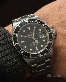 Titolo: Rolex Submariner Date ref 16610; Peso: 134.56; Misura: 16/21 ; Anno: 2009; Corredo: Scatola originale, Garanzia del rivenditore, Garanzia originale; Referenza: 16610; Carica: Automatico; Calibro: 3135; Rubini: 31; Colore quadrante: Nero; Corona: Acciaio; Diametro cassa: 40mm; Ghiera: Alluminio Materiale cassa: Acciaio; Materiale cinturino: Acciaio; Vetro: Zaffiro Cod:5518-b