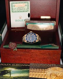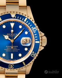 Rolex Submariner Date Ref. 16618. Blue Dial - Museum Condition - Full Set - Yellow Gold. N/S L937XXX. Iconico Rolex Submariner Date Ref. 16618 in oro giallo 18kt con quadrante blu sunburst e lunetta blu coordinata. Cassa da 40 mm con spallette proteggi-corona e bracciale Oyster in oro massiccio con chiusura deployante. Esemplare in condizioni da collezione, definibile “museum condition”, con dettagli estremamente nitidi e finiture ancora molto presenti. Quadrante e inserto perfettamente conservati. Corredo completo (Full Set) comprensivo di scatola, contro-scatola, garanzia originale, libretti, sigilli e accessori come da foto. Un classico intramontabile della produzione Rolex anni ’90 / primi 2000, tra i Submariner in oro più ricercati. Importante è comprare bene, non decidere solo sulla base del costo, ma dare importanza alla qualità e alla coevità.