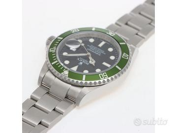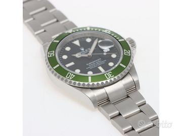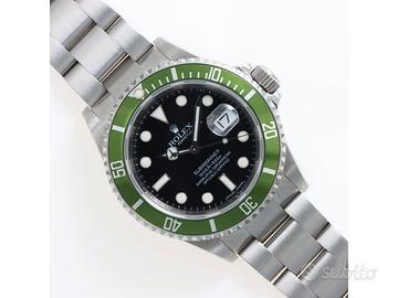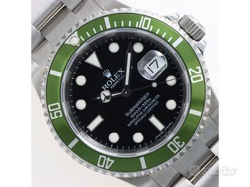 Clover Gioielli pone in vendita Rolex Submariner Date Ref. 16610LV Kermit con quadrante nero, cassa di diametro 40 mm in acciaio con anello RRR, corona di carica a vite, Ghiera girevole unidirezionale con inserto in alluminio verde, Bracciale modello Oyster in acciaio. Orologio in condizioni ottime. Seriale V33XXXX. Anno 2010. Full Set.