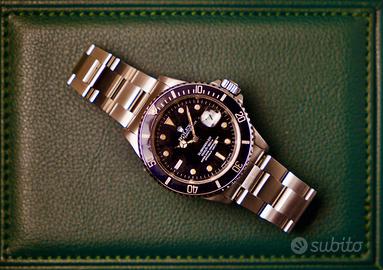 Rolex Submariner Ref. 16610 Zubmariner Zorro dial REF: 16610 Marca: Rolex Condizioni: molto buone Nome/Numero modello: Submariner Seriale: N Anno: 1992 Movimento: automatico cal. 3135 con 48 ore di riserva di carica Materiale cassa: acciaio Ghiera: in acciaio nera girevole unidirezionale Quadrante: Nero trizio Bracciale: Oyester 93150 Finali 501B Rolex Submariner Ref. 16610 cal. 3135. L’orologio condizioni molto buone, movimento automatico con 27 rubini e 48 ore di riserva di carica, il fondello è a vite. L'orologio misura 40 mm, mentre il cinturino 20 mm. Questo "Submariner" ha quello che i collezionisti a volte chiamano un quadrante "Zorro" perché la S in "Submariner" assomiglia a una Z al contrario. Orologio revisionato di recente e perfettamente funzionante OROLOGIO CON NOSTRA GARANZIA DI UN ANNO (NO GARANZIA ROLEX) OROLOGIO VISIBILE PRESSO IL MIO NEGOZIO DI PADOVA PREVIO APPUNTAMENTO. DICHIARO CHE L’OROLOGIO È ORIGINALE IN OGNI SUA PARTE