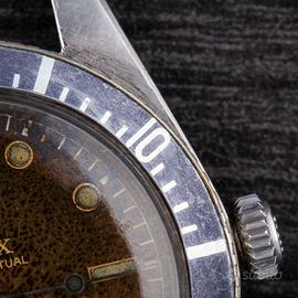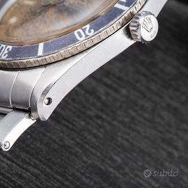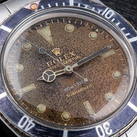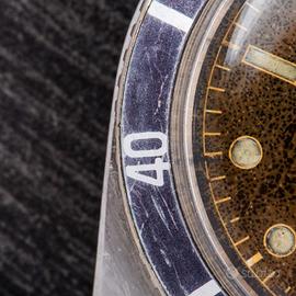 Rolex Submariner. Unpolished. Ref. 5508. Gilt. Brow Dial. N/S 48xxxx. Anno 1959. Carica Automatica. Cassa in acciaio. Cinturino in acciaio. Bracciale ref.7206 finali 80. 37. Vetro Plexiglass. Calibro di base 1530. Orologio con quadrante emozionante che appare disegnato e pensato da un'artista. Esplosione del colore raggiunti con il tempo si posiziona su una cassa probabilmente mai lucidata. Seppur presenta un inserto successivo alla data di produzione, nulla di ciò incide su un'unicità del grande fascino che questo segnatempo trasmette.