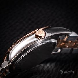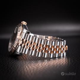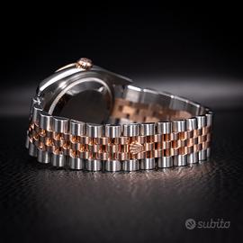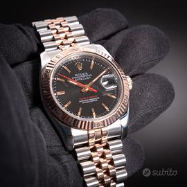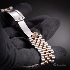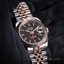 Elegante Rolex Turn-O-Graph referenza 116261 con raffinato quadrante nero, realizzato in acciaio e oro rosa. La ghiera in oro rosa dona un tocco sportivo ma al tempo stesso estremamente sofisticato, perfettamente abbinato al prestigioso bracciale Super Jubilee che garantisce comfort e grande presenza al polso. Orologio dal design iconico e versatile, adatto sia ad un utilizzo quotidiano che ad occasioni più formali. Movimento automatico di alta precisione, tipico della manifattura Rolex. L’orologio viene venduto come “solo orologio”, accompagnato da: •Nostra garanzia di 12 mesi sul buon funzionamento •Certificato di originalità •Regolare fattura di vendita NB: piccolo segno sul quadrante in corrispondenza dell’indice ore 10.