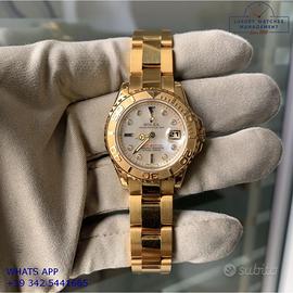 Rolex Yacht Master Ladies da 29MM oro giallo 18KT, anno di produzione 1996, ghiera oro giallo 18KT bidirezionale a scala graduata 60 minuti in rilievo, vetro zaffiro antiriflesso con lente cyclope, quadrante madreperla con data, indici diamanti sfere al trizio, movimento meccanico a carica automatica, bracciale Oyster oro giallo 18KT con chiusura deployante originale Rolex.