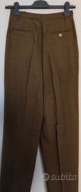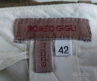 Vendo pantaloni donna di Romeo Gigli originali indossati solo un paio di volte, in perfette condizioni, colore beige, molto eleganti, in lana 100%, gamba leggermente a sigaretta, vita alta, abbottonatura a uomo con patta e bottoncini, tasche a filo sul davanti e 2 con bottoni sul retro, passanti in vita, vestibilità regolare, taglia 42 ita, made in Italy. Misure: lungh. tot gamba esterna cm 102, lungh gamba interna cm 75, circonferenza vita cm 68, largh. fondo gamba cm 21. Prezzo eu 90 leggermente trattabile.
