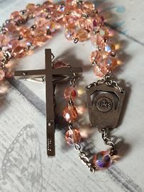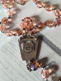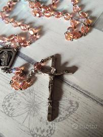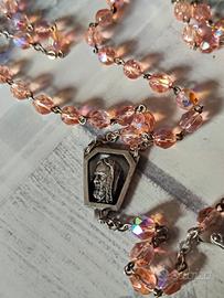 Questo dettaglio rende l'oggetto un rosario devozionale dedicato specificamente al Santo, molto diffuso tra i fedeli per la preghiera d'intercessione. La combinazione dei grani in cristallo rosa con l'immagine di Padre Pio è comune nei modelli artigianali italiani o provenienti da luoghi di culto come San Giovanni Rotondo.