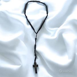 Rosario, fatto a mano, in legno e corda marrone scuro.