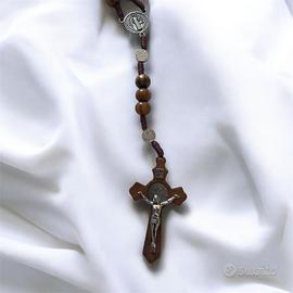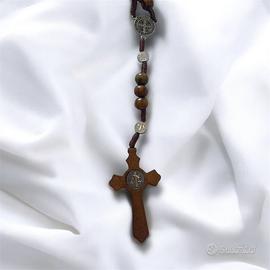 Rosario, fatto a mano, in legno con crocifisso in legno e metallo rialzato. Lunghezza 46 cm circa.