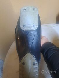 Come da foto ci notano imperfezioni estetiche di graffi usati e l'usura sotto lo scafi. USATI per 5 anni, 5/6 volte a stagione. Allo scarpone destro bisogna incollare un po la soletta che si muove un pó, ma una volta indossato non si muove.