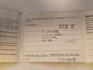Scatola originale e garanzia datata 19/01/1986 (40 anni precisi) rilasciata da H. Samuel di Plymouth (GB), negozio che esiste tutt'oggi.