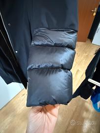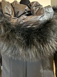 nero in tessuto idrorepellente con cappuccio removibile in vera pelliccia, inserto in tessuto trapuntato, due tasche nascoste sulla parte frontale con chiusura a zip, chiusura principale a zip con doppio cursore e bottoni a pressione, logo posizionato sulla spalla sinistra.