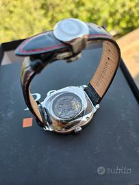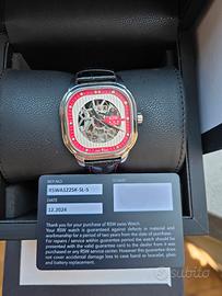 Quadrante: modello scheletrato rosso. Lancette e indici color argento. Cassa di forma quadrata.