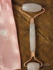 Rullo doppio per skincare in quarzo rosa di Oltre il Sole, completo di sacchettino rosa (dal vero, risulta un rosa più acceso). Mai utilizzato.