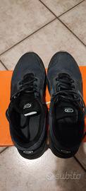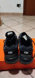 Scarpa da corsa della kalenji. Colore nero, bianco e grigio. Scarpe usate con segno di usura su suola ed etichetta.