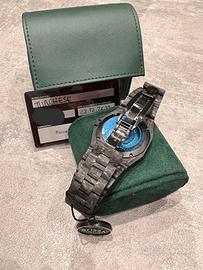 Insieme all’orologio viene venduta la box da viaggio in pelle, la card in metallo (certificato di autenticità) con numerazione e colore del quadrante e un cacciavitino per la rimozione delle maglie.