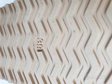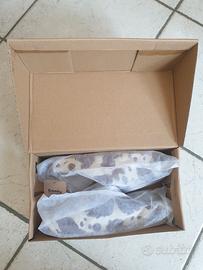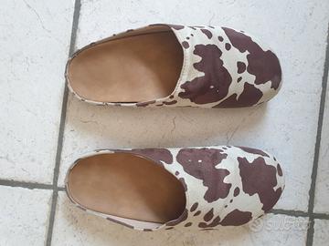 Comode ciabatte sabot con una divertente fantasia a macchie di mucca. - Fantasia a macchie marroni e bianche. - Taglia 39. Come nuove, finta pelle morbida, soletta comoda. Confezione originale con cartellino da 39 euro. Spedizione visto e piaciuto.