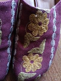 - Ricami gialli e verdi su tessuto bordeaux.