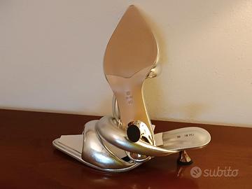 Sabot mocassino da donna in ecopelle vegana di colore argento il modello glamour di tendenza con tomaia in pelle vegana tacco da 05 cm. sc063. Lunghezza 28 cm.(tacco/punta). larghezza della pianta 09 cm. Muniti di tacchi di ricambio e dust bag. Originali ed autentici. Collezione Mules: Sara. JW PEI