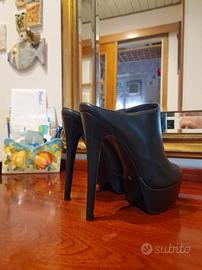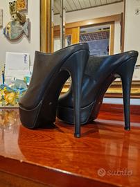 Sabot/Mules Numero 42. Morbide e comodissime. Adatte per ragazza/donna. Pelle nera con Punta Rotonda, Piattaforma cm. 5 e Tacco a Spillo in pelle nera cm. 15 aperte dietro. Foderate internamente in pelle nera. Zeppa e tacco a spillo foderati in pelle nera. Adattissime per discoteca, night, casa, relax. Nuovissime, indossate solo per prova sulla moquette. Mai usate oltre la prova, neanche in casa. Suola perfetta, con la pellicola trasparente di protezione ancora da togliere. Pianta comoda. Vendo per numero errato piu' corto del dichiarato. Calza perfettamente 40-41. Acquistate ad Euro 71.39 vendo ad Euro 50.00 compresa spedizione. Assicurasi contenuto anonimo. Spedizione velocissima. Fornisco Tracking Number di Poste Italiane. Spedisco appena ricevuto il pagamento.