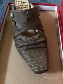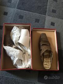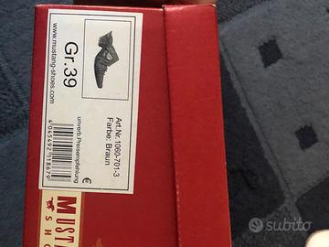 Vendo bellissimi sabot (muli) originali a marchio Mustang Shoes, colore marrone (Braun), completi di scatola originale. Le scarpe presentano un design unico d'ispirazione western/urban, con cuciture a contrasto, piccoli trafori decorativi e l’iconico logo Mustang stampato sulla soletta interna. Sono perfette per chi cerca uno stile distintivo ma comodo. Dettagli principali: • Marca: Mustang Shoes • Taglia: 39 • Colore: Marrone (Braun) • Modello: Art. Nr. 1060-701-3 • Condizioni: Ottime, come si può vedere dalle foto. La tomaia è integra e gli interni sono puliti. • Caratteristiche: Punta sfilata, tacco basso e stabile, calzata pratica e veloce. Ideali per la mezza stagione, si abbinano perfettamente sia ai jeans che a gonne lunghe per un look boho-chic.