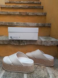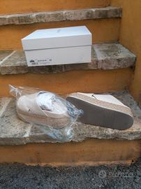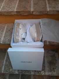 Sabot brand spagnolo Equitare Elka Napasoft – colore bianco Glacial con zeppa 100% pelle, corda intrecciata e suola in eva. La tomaia è realizzata in vera pelle, così come la fodera. Due fasce si intrecciano sul davanti.L’altezza della zeppa anteriore è di 6 cm, mentre quella posteriore è di 6,5 cm.