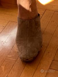 Sabot scamosciati color verde/grigio, suola legno, tacco 12 cm, marca Castagner, taglia 39 ma calza 38