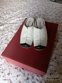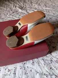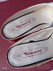 Scarpe Tamaris di pelle aperte dietro tipo sabot color bianco, rosso con punte nero tacco 3cm, quasi nuove con soletta antiscivolo. E scritto 41 come misura ma calza pitosto un 40,5.