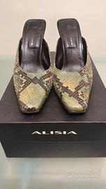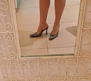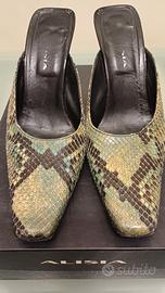 Splendido paio di sandali sabot (chiusi in punta aperti dietro) in vero pitone verde acqua. Taglia 38, tacco 10 cm. Vera pelle, fatto a mano, unico modello in quanto parte di un campionario di scarpe. Conservato benissimo, squame perfette e senza alcun difetto. tacco largo quindi scarpa comoda nonostante il tacco alto. Colore molto particolare, dall'azzurro al verde, che si sposa benissimo sia con abiti eleganti che con i jeans