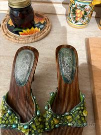 Le scarpe presentano una fascia anteriore riccamente decorata con perline e pietre colorate sui toni del verde. La zeppa è molto leggera, con un particolare effetto legno scuro.