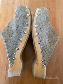 Zoccoli Berkerman in legno e pelle con suola rivestita in gomma, sono presenti borchie laterali, tg. 42.5, ma vanno bene sia ad un 42 che ad un 43, vendo e.50