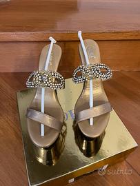 Sabot con fascia gioiello, plateau 5 cm, tacco 15 oro, n 37 usati una sola volta per sfilata di moda. Molto eleganti e versatili.