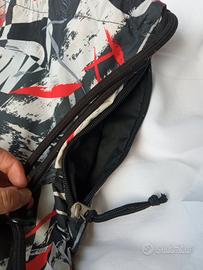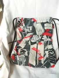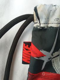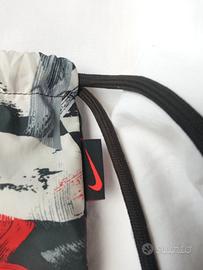 Sacchetta Nike stampa fantasia con logo visibile, tessuto impermeabile, cordoncino nero (regolabile all'interno) per chiusura a coulisse. Con piccolo moschettone, tasca interna chiusa da cerniera esterna. Ben tenuta, unico piccolo foro su in lato.