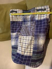 Pratica sacca sportiva a cilindro in cotone e con chiusura a coulisse a motivi patchwork (marca Giovanni) ed annessa borsetta della Lotto, porta necessaire, con specchietto interno e gancio (sempre interno) per appenderla. La sacca è provvista di ulteriore tasca interna incernierata. Si possono abbinare per un uscita al mare oppure per un viaggio nel week-end. Si vendono in coppia. #bag, #sac, #tasche, #bolsa.