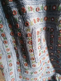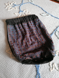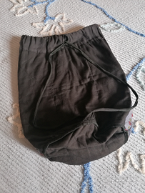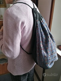 Sacca in tessuto nero con decorazione sul fronte in blu, verde e marrone. Molto leggera e pratica per la spesa, per il mare o le passeggiate. Si indossa come zainetto o se si preferisce a spalle. Usata pochissimo.