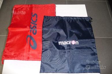 Sacche portascarpe/portaindumenti, disponibili 18 pezzi, 6 Mizuno misura 34cm x 45cm colore blu chiaro, 3 TSL misura 39cm x 44 cm colore nero, 4 EST Made 29cm x 39cm colore arancio, 1 Asics 31cm x 39cm colore rosso, 1 CMP 34cm x 42cm colore nero, 1 Macron 34cm x 38cm colore blu scuro, 1 KM Sport 33cm x 45cm colore arancio e nero con tasca anteriore in rete con zip (6£), 1 Vertical Sport 23 cm x 37cm colore blu con velcro, nuove, premi di competizioni sportive